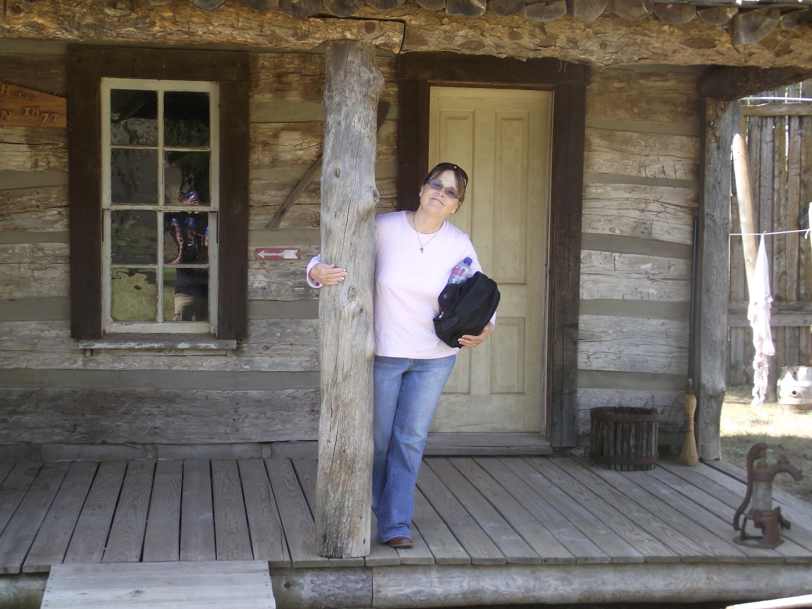 Jeanette waving from the front porch of the actual log cabin (it was relocated to Medicine Lodge in the mid 1900's) |